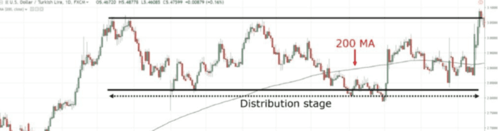 市場不會永遠上漲,當賣盤開始壓制價格時,首先會進入派發階段。表現爲上漲趨勢中的區間震盪,200日均線再次走平,價格圍繞均線震盪,顯示市場再次進入多空平衡狀態。