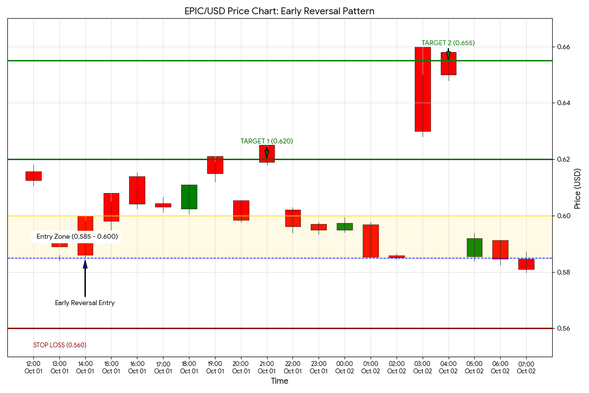 EPIC顯示出早期反轉的跡象。如果價格保持在0.585以上,可能會繼續向0.620和0.655移動。