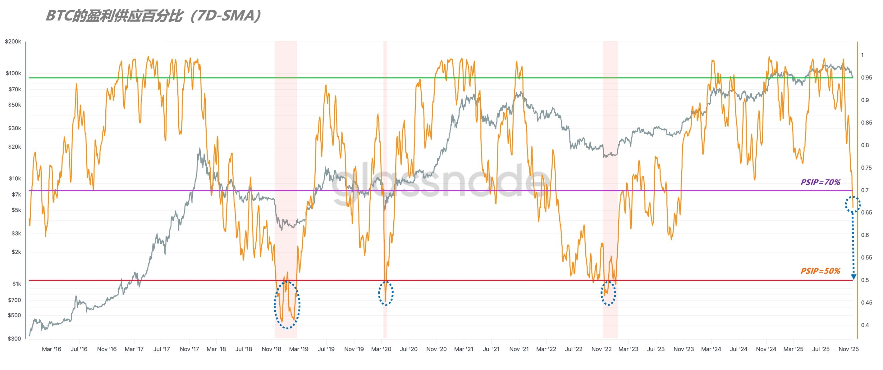 圖表顯示,PSIP低於 50% 的時刻,往往意味着盈利盤已被充分擠壓,市場情緒進入深度悲觀區,這些時間點幾乎都對應着極具性價比的長期買入機會。