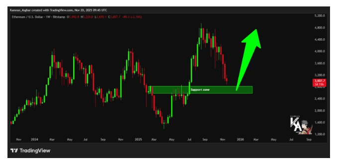 ⭐ ETH 現在的交易價格接近 $3,007,回落至許多人認為的每週時間框架中的最強支撐區域。這一區域大約在 $2,800 和 $3,000 之間,之前發動了重大反彈,現在在數週的下行壓力後重新測試。交易者心中關心的問題是這一基礎是否能再次保持。