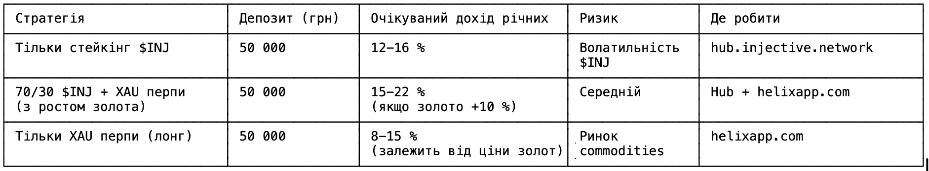 35 000 грн → 購買 $INJ → 在 Hub 上質押 → ~12-16% 年收益 = 4200-5600 грн/年