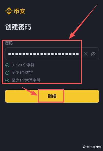接下来就到了创建密码的部分,我们按照他的要求,8个字符以上、包含至少一个数字、和至少一个大写字母。创建一个币安的密码,点击【继续】。