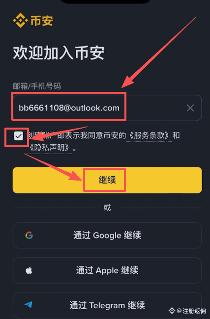 这里我就以邮箱来 演示一下注册。输入进我们的邮箱,勾选同意,点击【继续】。