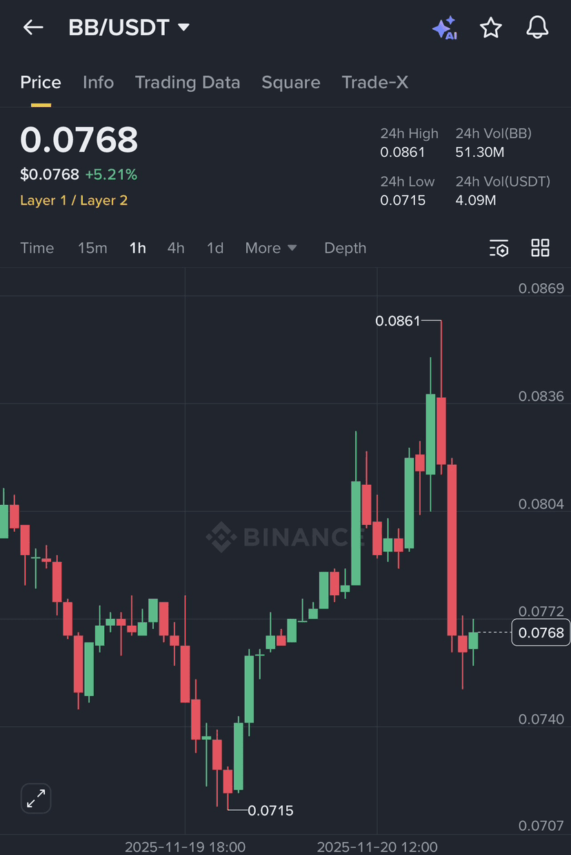 $BB 今天出現了急劇的波動,觸及$0.0861後迅速回調——經典的流動性獵殺行爲。有趣的是,它在$0.072附近找到了支撐,並立即嘗試重新奪回結構。📈