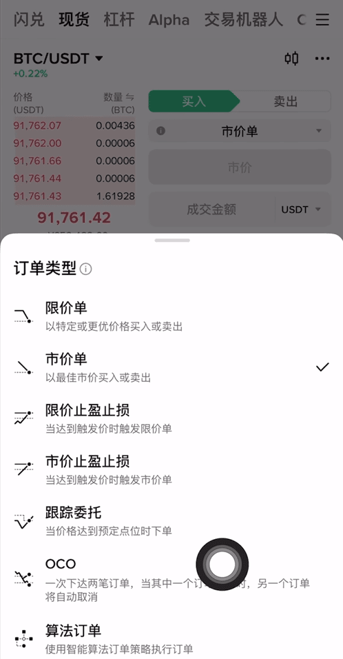 幣安提供了豐富的下單方式,點擊買入/賣出下方的下拉菜單即可選擇: