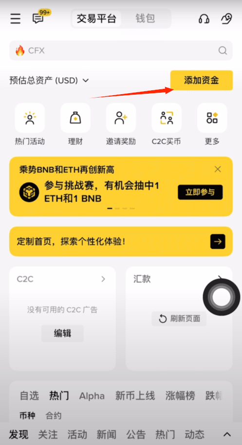 在幣安首頁點擊上方的 【添加資金】 (Deposit),主要有兩種方式: