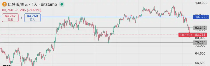 之前比特幣沒能突破前期高點,跌破10.7萬美元的關鍵位,一路下探到10萬美元以下。一旦跌破10.7萬,技術面上轉熊,就往9.2萬走。9.2萬現已破位,上週五最低跌破8.1萬。下一個阻力位是7.5萬。