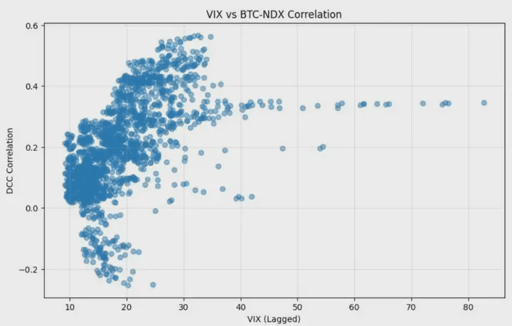 這篇論文通過迴歸分析發現:市場恐慌指數 (VIX) 的係數爲0.0106,即VIX每上升1個單位,BTC和納指的動態相關性就增加0.0106。
