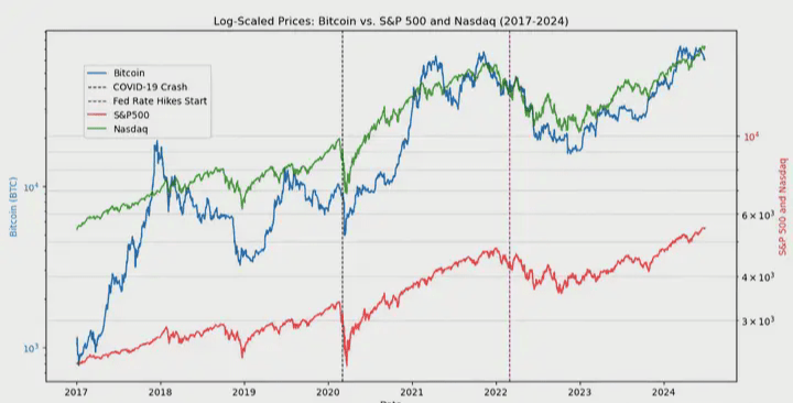 1. 比特幣和納指高度相關,但誰影響誰,方向不固定,有時候比特幣引領納指,有時納指引領比特幣。