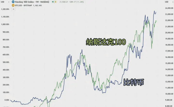下面這張圖我發過好幾次。用的是自2019年起的週數據,發現比特幣與納斯達克100的相關係數高達0.92。