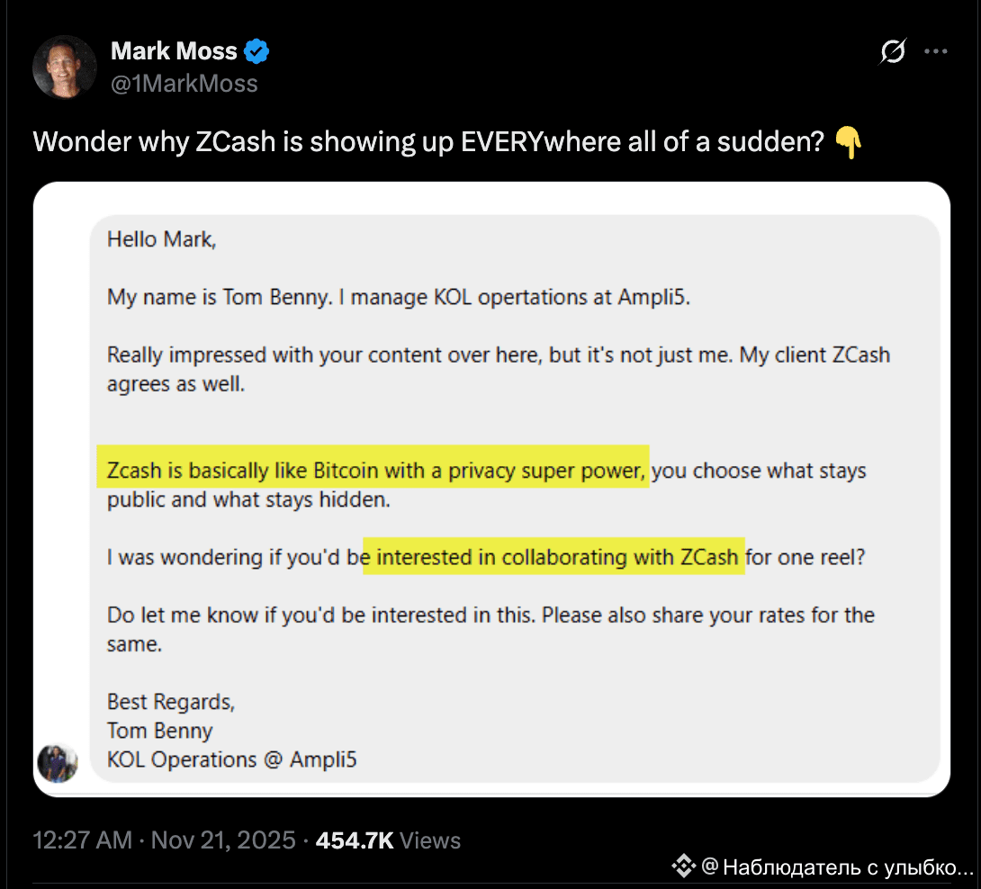 Подкрепляя медвежьи настроения, Марк Мосс, венчурный капиталист и преподаватель, специализирующийся на биткоине, поделился скриншотами рекламных сообщений от маркетинговых агентств, предлагающих платное сотрудничество с ZEC.