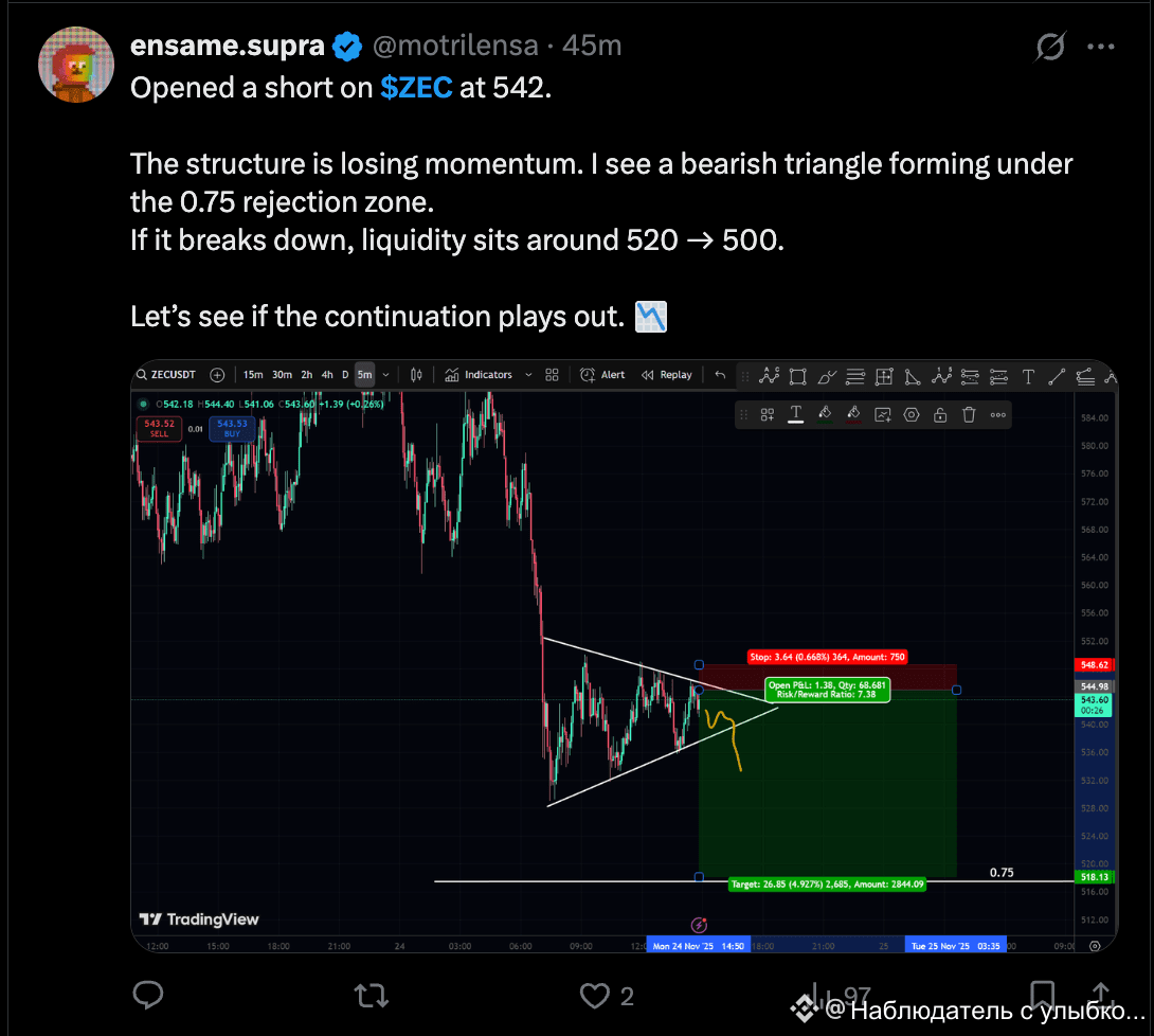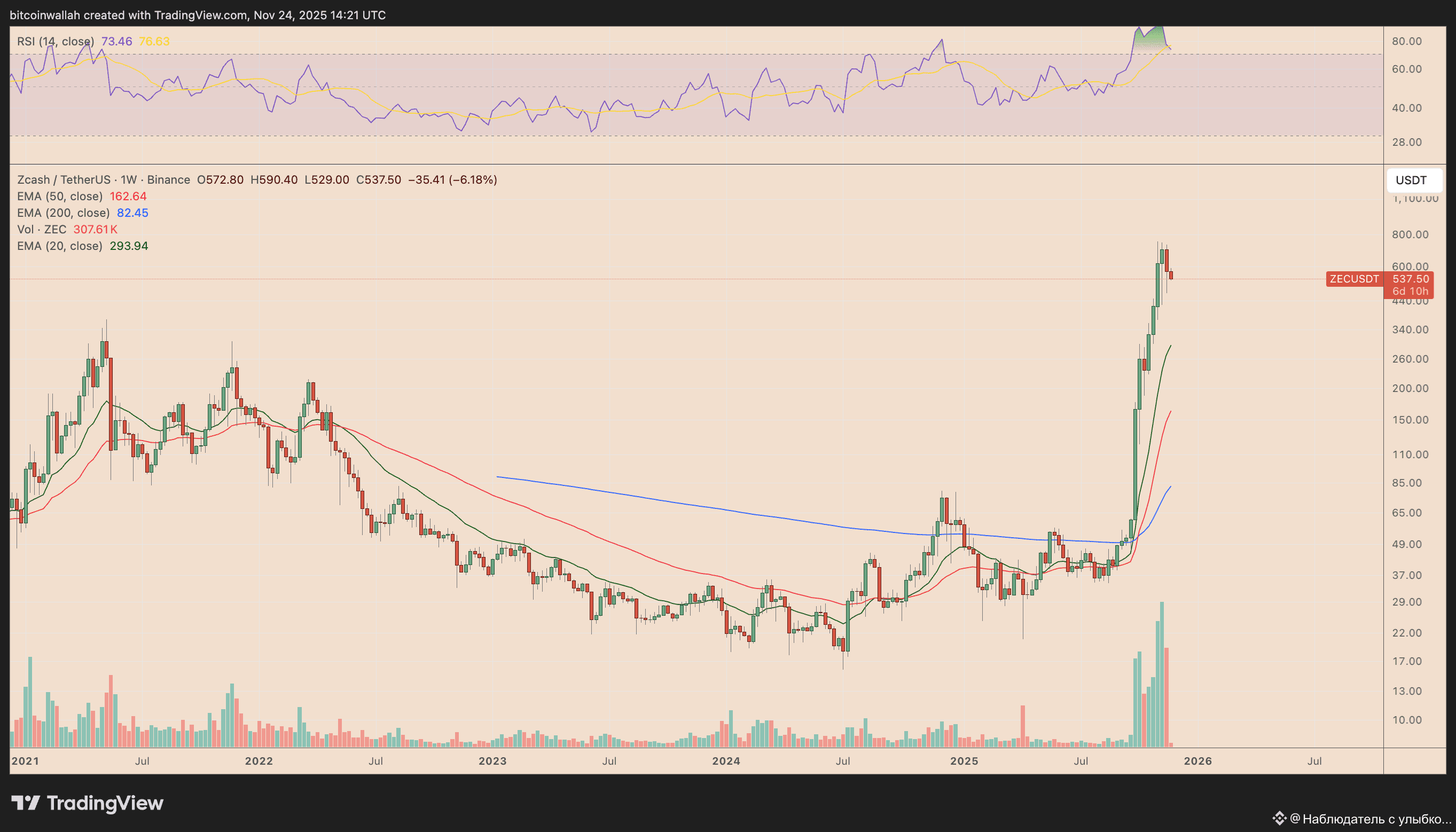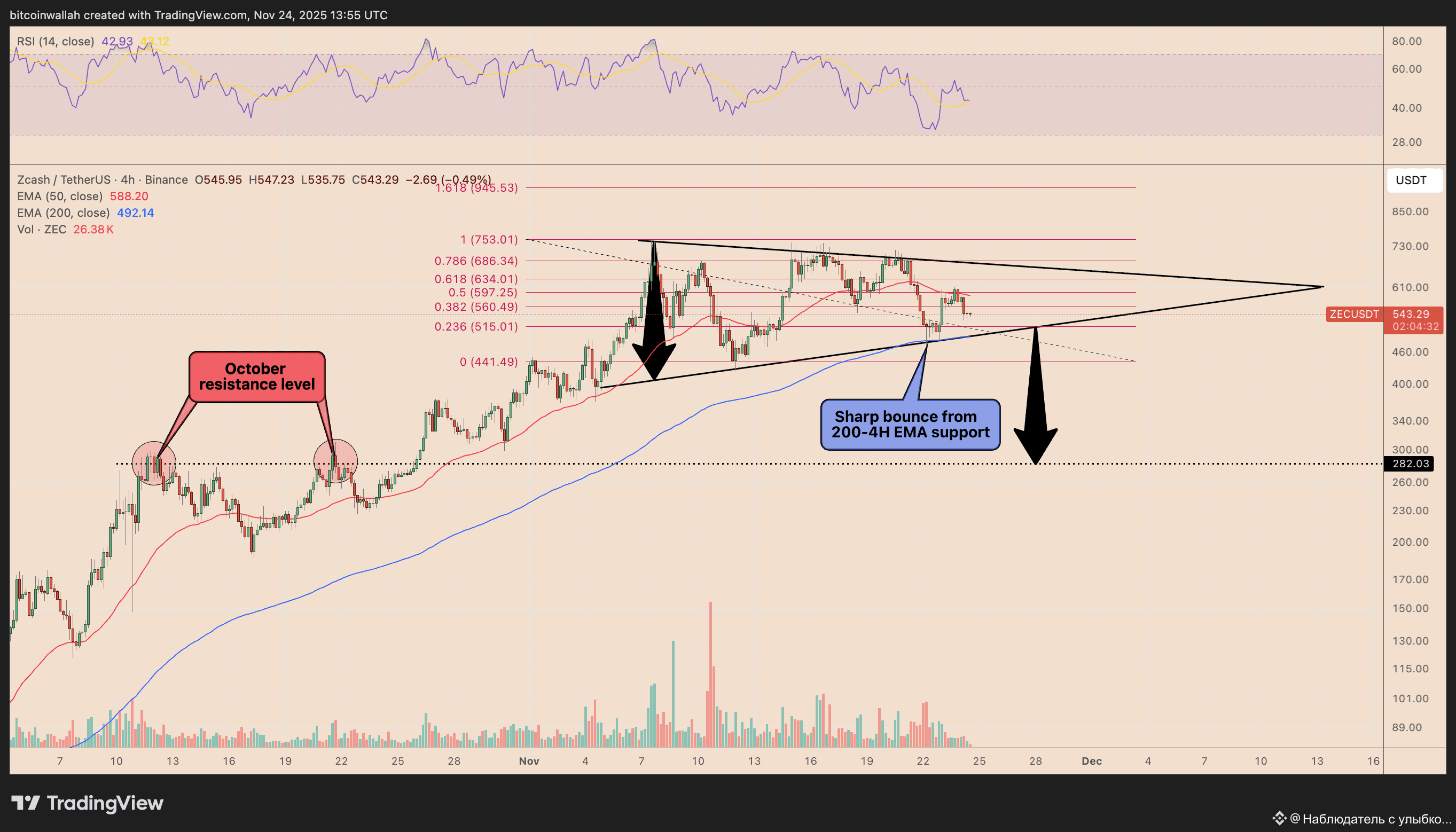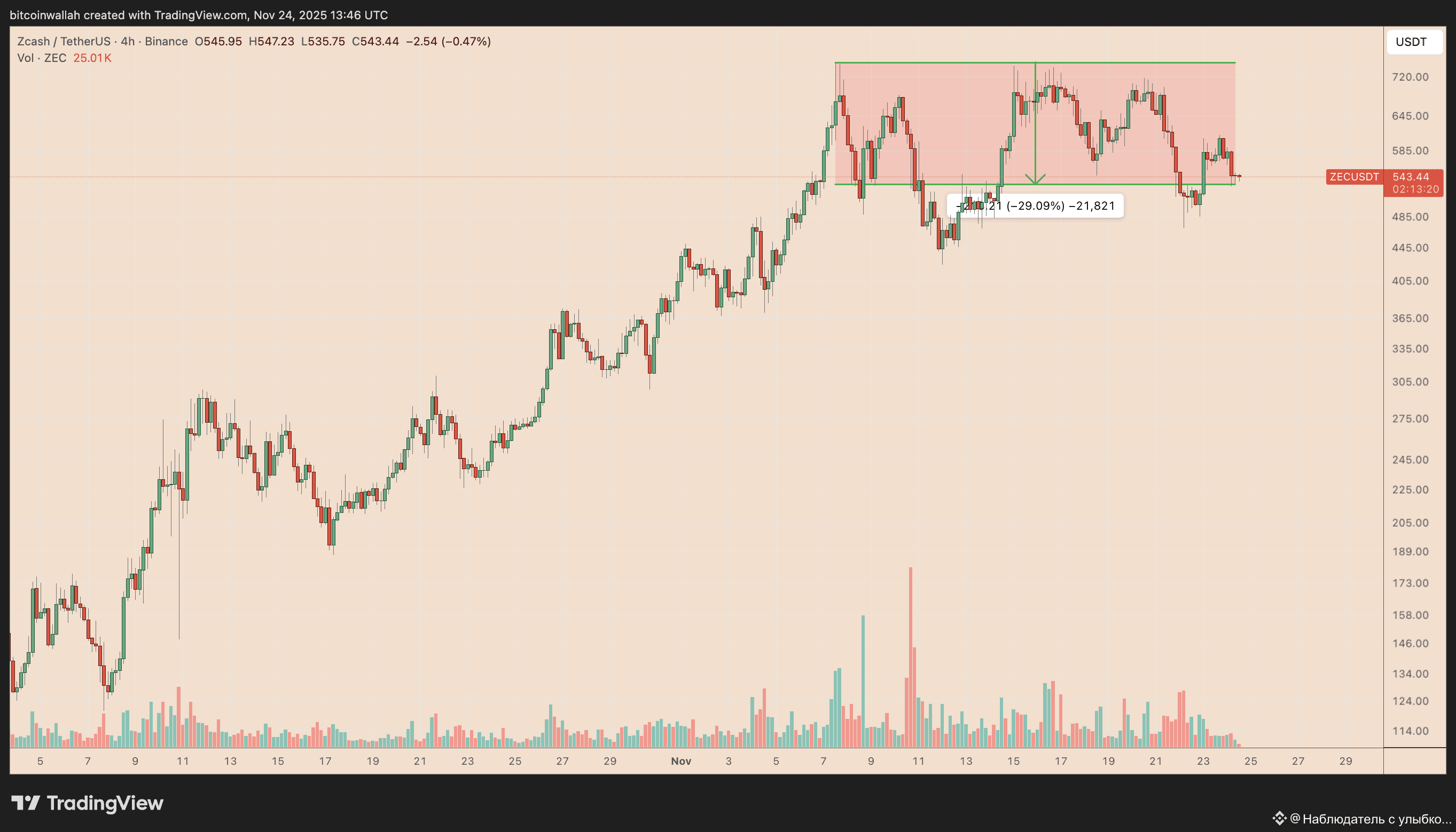 Zcash (ZEC) упал примерно на 30% с ноябрьского пика в $750, что усилило опасения по поводу будущих более существенных потерь. Некоторые аналитики предупреждают о потенциальном «накачке и сбросе».