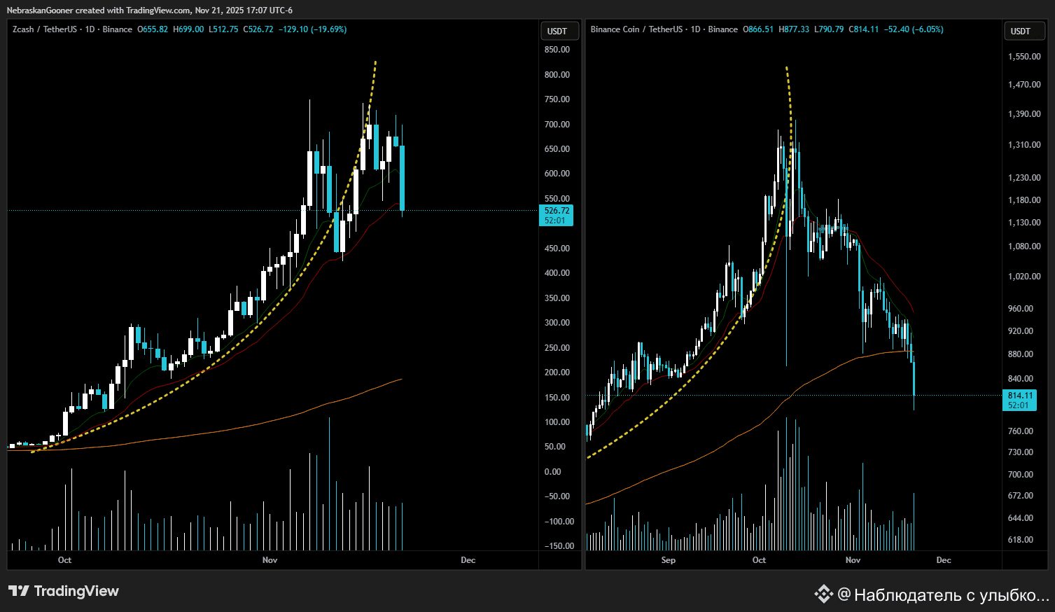 По словам трейдера Nebraskangooner, текущая структура Zcash напоминает параболический рост и пробой, ранее наблюдавшиеся у BNB (BNB) до его резкой коррекции.