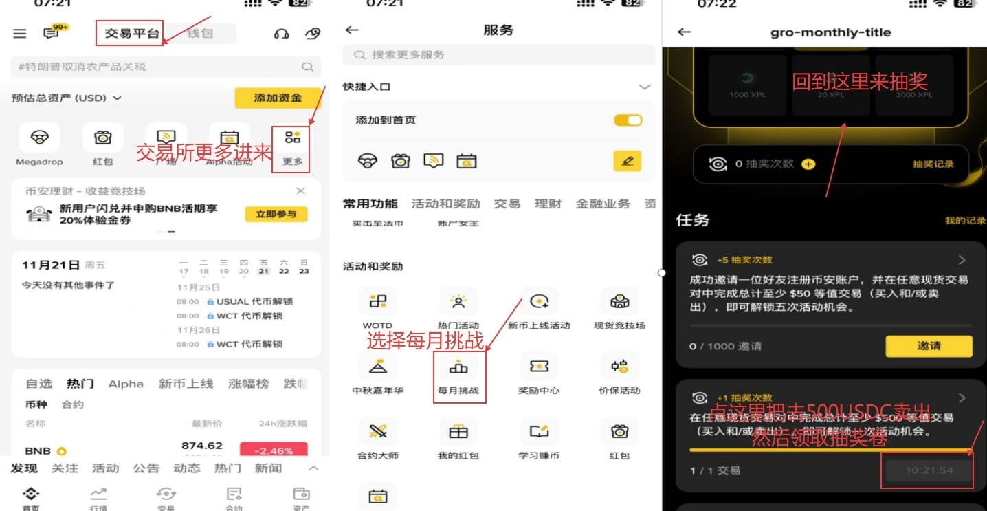 一定要先去每月挑戰裏面點交易,自動切換到#现货交易 界面,再進行兌換,不然不算你完成任務,任務完成後再回到每月挑戰裏面抽獎,每天可以抽一次。