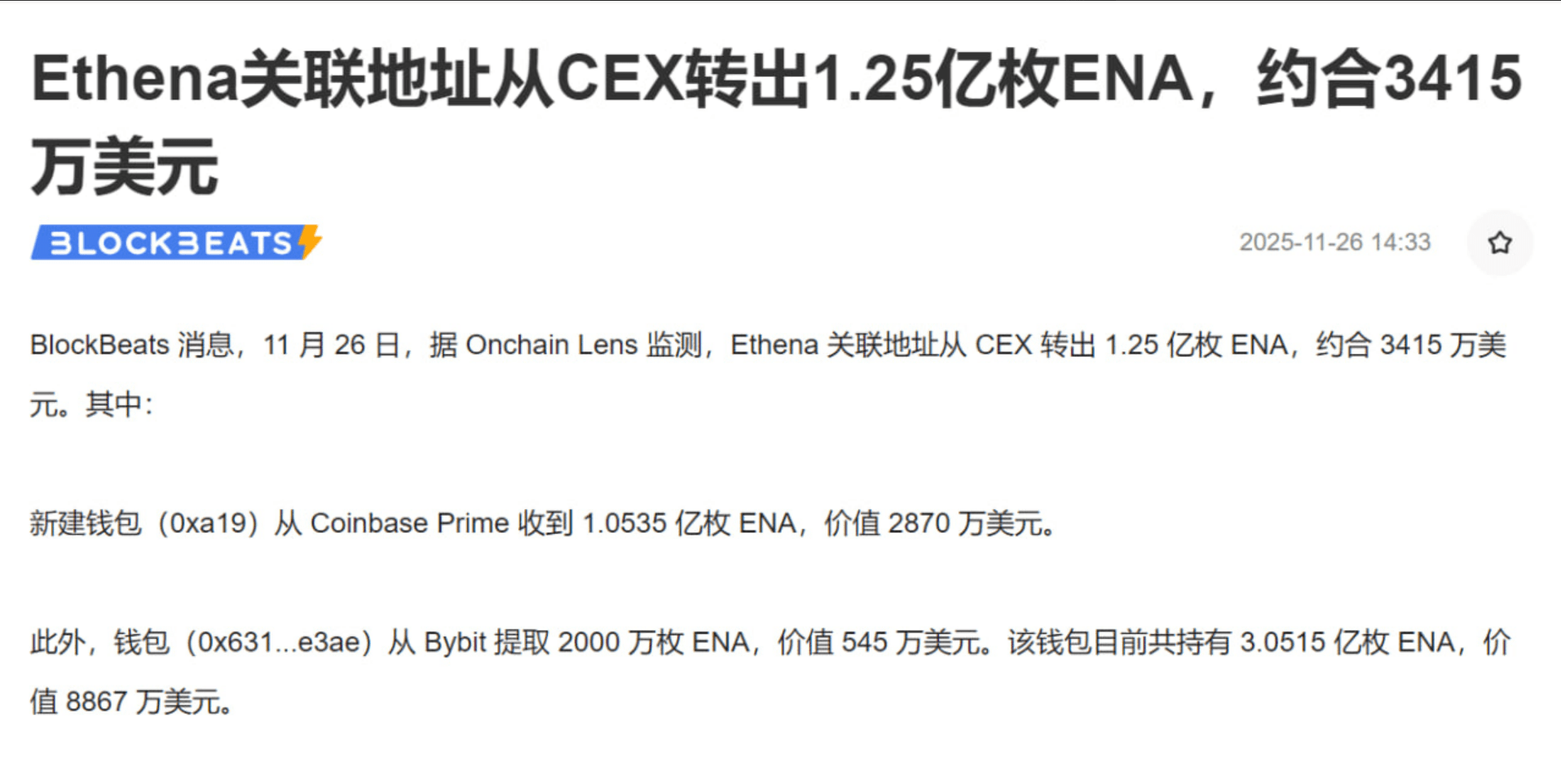 不是簡單出貨:新建錢包(0xa19)從Coinbase Prime接收1.0535億ENA,這更像是資金調配而非拋售