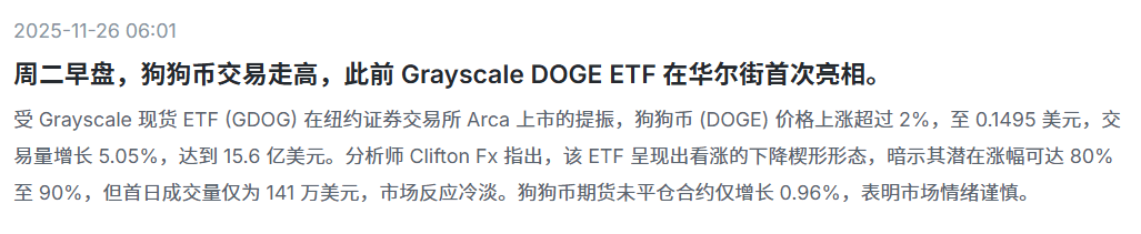兄弟們,今早DOGE突然竄了2%!爲啥?因爲華爾街終於給狗狗幣開了“正門”——Grayscale的DOGE現貨ETF(GDOG)在紐交所Arca掛牌了!這相當於機構拿着錢袋子正式進場掃貨的信號,就像你家樓下開了家“官方狗糧店”,以後買DOGE不用偷偷摸摸了。但這事真這麼簡單?首日成交才141萬美元,機構是真看好還是憋着壞?往下看,我用5年幣圈“笨功夫”給你拆透!