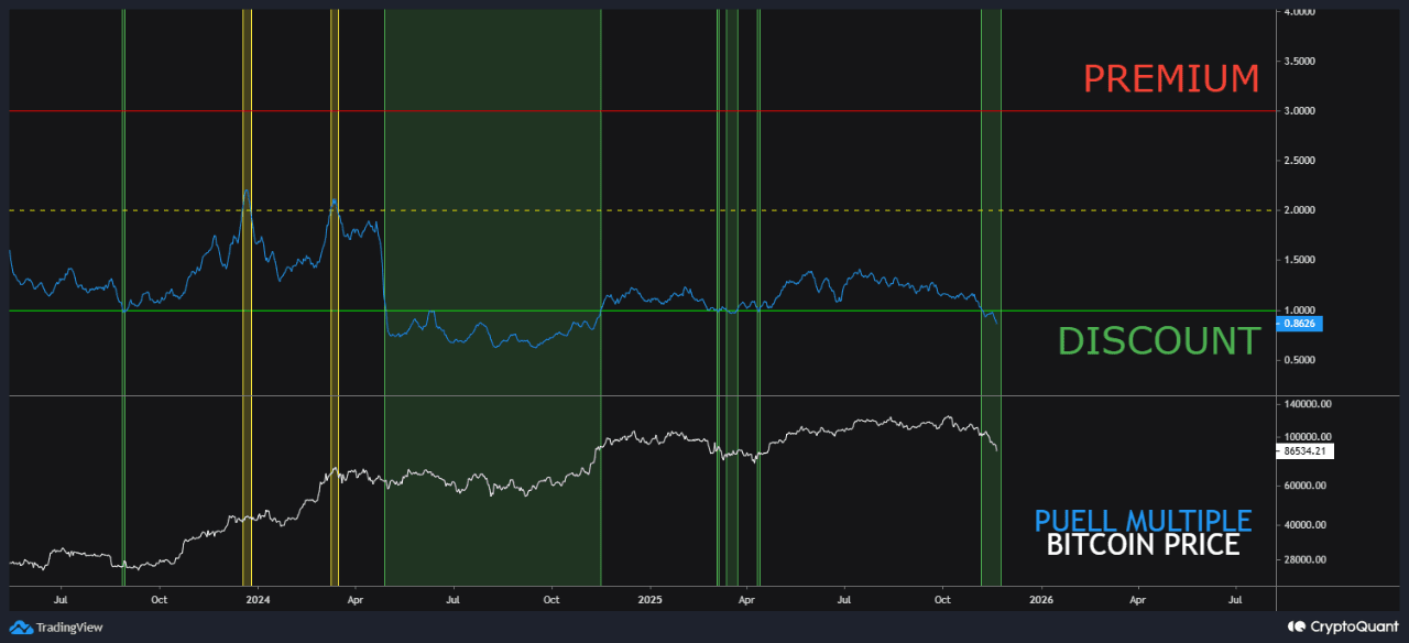 普埃爾倍數(Puell Multiple)又掉回“折價區”了,這地方在比特幣歷史上基本就是“每次來一次,行情洗一次”。上次是今年 3 月,比特幣打到 75,000 美元附近,這次又是同樣的味道。普埃爾倍數掉到 1 以下,就是礦工收入比年度均值低一大截,屬於“越挖越窮”的階段,而這種情況往往出現在市場最悲觀、價格最接近底部的時候。2019、2020、2022 的大行情,全都是在普埃爾倍數趴在地板上時慢慢醞釀起來的。雖然它掉到折價區不是讓你立刻梭哈的信號,但意思很明確,下行風險不大了、賠率變好了、長期資金會開始磨刀了。簡單講:普埃爾倍數現在的樣子,就是市場在悄悄把“底部窗口”打開的樣子。