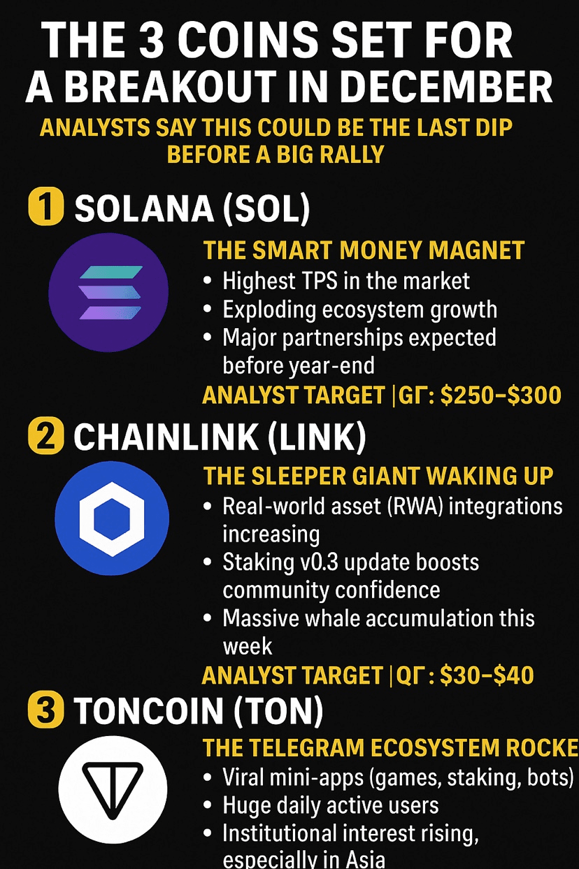 加密市場再次升溫——根據多位分析師和鏈上指標,三個主要硬幣顯示出強烈的12月突破跡象。這些項目具有真正的動能和即將到來的催化劑,可能會觸發大規模的價格波動。