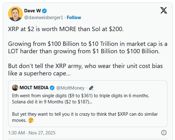 與此同時,前CoinRoutes主席及比特幣倡導者Dave Weisberger反駁了Molter的觀點。他表示,XRP在$2的價值已經高於Solana在$200的價值,這暗示著XRP要從$2的水平進一步上漲需要更多的資本。