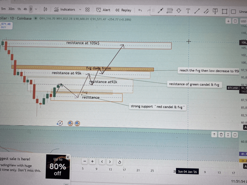 根據我自己的分析,我看到比特幣將達到87k $BTC ,隨後在92k處形成一個"W"(上升雙底),然後達到95.5k,當時它將面臨來自綠色蠟燭錘子的阻力,再次達到#92k(回測),從這個價格比特幣將上漲到#97k,當時它將經歷#FVGZone 並下降到#95k,獲得支持(舊#阻力),然後移動到#105k,在#2026之前。
