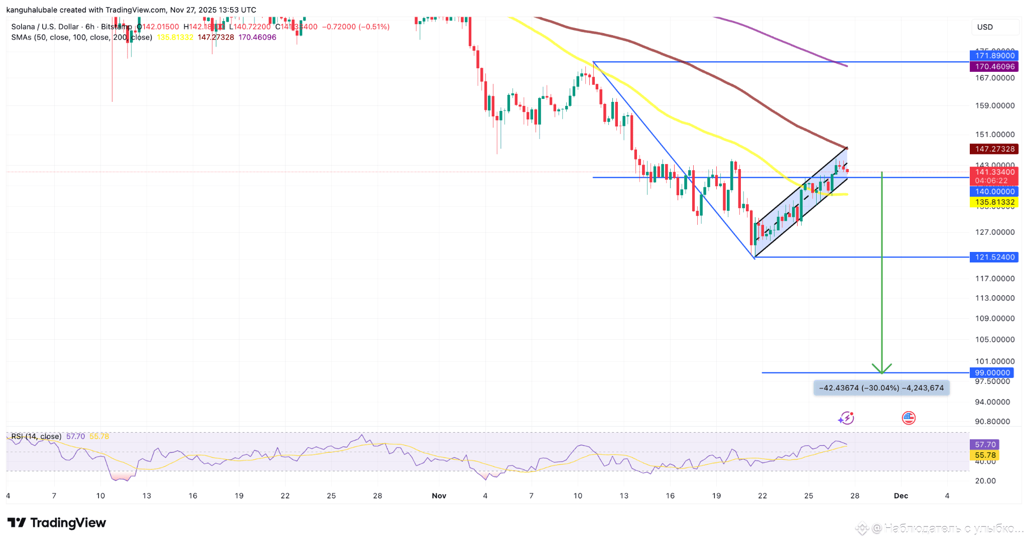 Ценовая динамика SOL сформировала классический паттерн «медвежий флаг» на шестичасовом графике — медвежий паттерн продолжения тренда, образующийся, когда цена консолидируется вверх в параллельном канале после резкого снижения. В случае Соланы формирование флага началось после того, как 17 ноября SOL достигла максимума на уровне около $170. С тех пор консолидация продолжается: цена постепенно поднимается и повторно тестирует линию поддержки флага, которая в настоящее время находится на уровне $140.