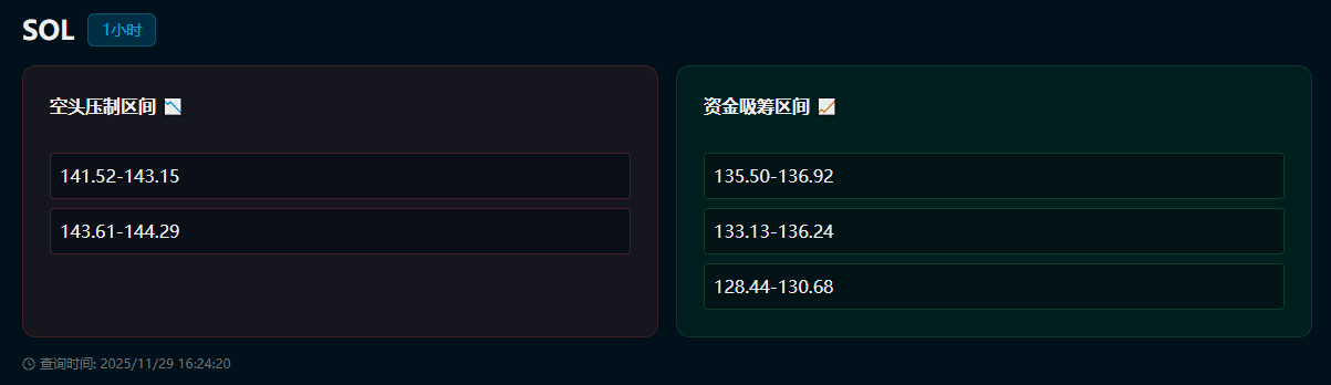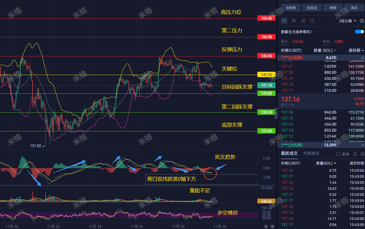 從小時圖看,SOL現在卡在關鍵位140附近,上方壓力重重——145是反彈壓力,150是第二壓力,155那可是高壓力位,衝上去不容易。下方支撐呢?137.16是目標回踩點,135是第二支撐,130和125是最後的防線。