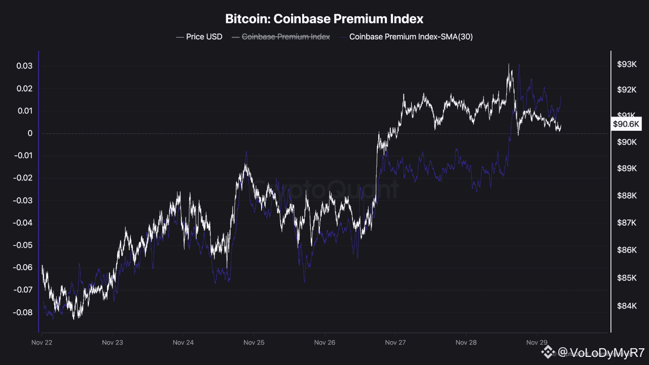 Ринок біткоїнів, здається, демонструє ознаки стабілізації та повертається до свого попереднього стану, про що свідчить відновлення критичних показників. Зокрема, ставка фінансування — проаналізована як 72-годинна середня, повернулася в позитивну зону, що часто вказує на перезавантаження ринкових настроїв. Ця тенденція додатково підтверджується індексом премії Coinbase; використовуючи 30-періодну SMA на 1-хвилинному таймфреймі, цей індекс також став позитивним. Узгодженість цих технічних індикаторів вказує на те, що ринкові умови можуть повертатися до встановленого базового рівня.
