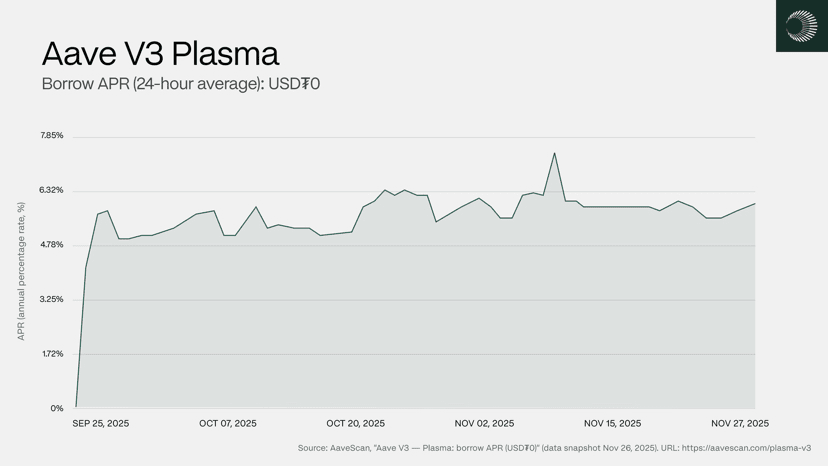 APR 數據清楚地顯示了均衡。在 5–6% 的走廊內保持借款利率兩個月,儘管供應在 66 億美元到 17 億美元之間波動,這是當信用需求是有機時會看到的結果。利率沒有隨着 TVL 的變化而崩潰。在提款期間沒有飆升。它的行爲像是由市場活動而非激勵懸崖驅動的資金曲線。這就是 Plasma 的獨特優勢:可預測的融資。