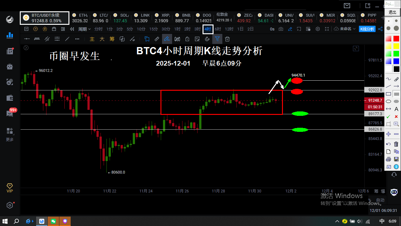 一、比特幣4小時週期K線縮量下跌(截止至早上6點09分~見截圖),比特幣4小時週期K在紅色箱體通道內盤整(將會面臨方向的選擇),目前量能表現不佳,請勿盲目追高,在截圖標註的支撐位可以考慮做多單或現貨布局進場;