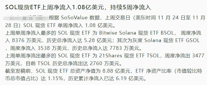 別看價格跌了,機構卻在悶聲撿籌碼!上週SOL現貨ETF淨流入1.08億美金,連續5周淨流入!其中Bitwise的BSOL單週吸金8376萬刀,灰度GSOL緊跟其後。