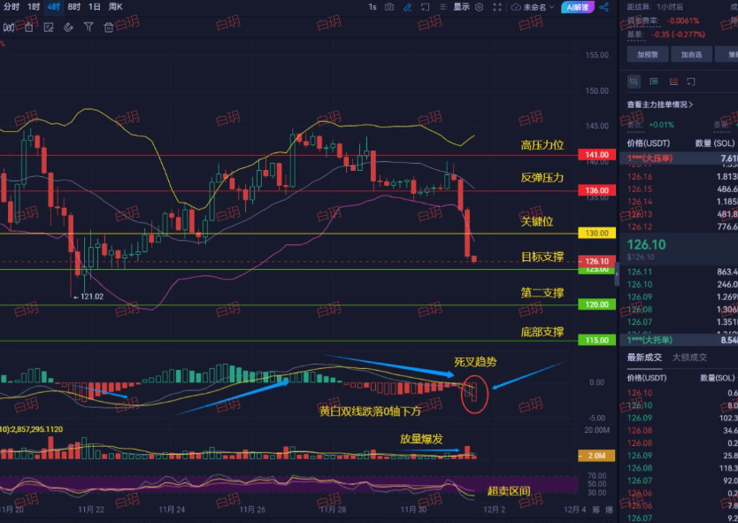 1小時圖上,一根大陰線直接從141刀砸到126刀,現在價格在126.1刀附近掙扎,短期跌了5.5%!不少人在問:是不是要大跌了?別慌,白玥結合最新消息和技術面,給你說透!