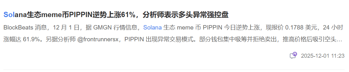 今天Solana生態有個叫PIPPIN的 meme 幣突然逆勢暴漲61%,圈內都在傳是有“巨鯨錢包”集中吸籌、死活不賣,硬把價格推了上去。這消息不光是個熱鬧——它說明 Solana 鏈上的資金情緒沒冷,大戶還在找機會動手。那麼 SOL 本身呢?會不會跟着來一波?