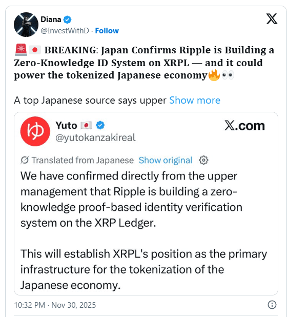 戴安娜在X上的一則帖子中報道,日本的高層管理人員“直接確認”Ripple正在開發一個基於XRPL的零知識身份系統。如果準確的話,這個系統可能會在全國範圍內實現安全、私密和可驗證的數字身份。