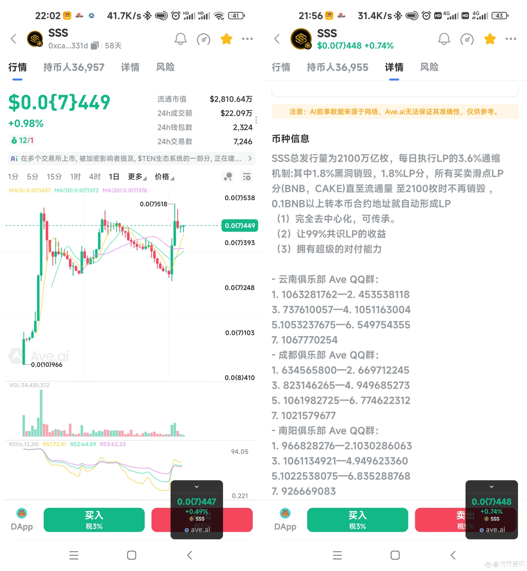 · 持续激励,共享红利:设计无限挖矿分红机制,收益不仅来自代币本身(SSS),更锚定BNB、CAKE等主流资产价值,为参与者提供持续、多元的收益流,鼓励长期持有与建设。