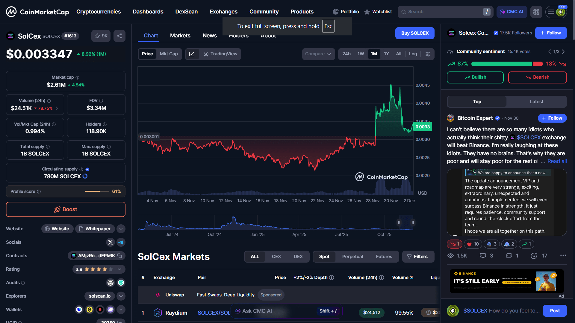 短期爆發:儘管長期大幅下降,SOLCEX在過去一週顯示出強勁的短期動能,過去一週上漲超過51%(過去一個月上漲37%),目前交易價格接近0.0040美元。