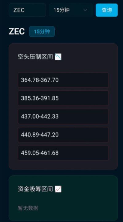 雖然價格從340低點拉到361,但目前仍在“空頭壓制區間(364.78–367.70)”下沿震盪。15分鐘圖顯示上方層層壓力(385–462區間),且“資金吸籌區間”依舊沒數據,說明多頭根本沒組織起像樣的反擊。