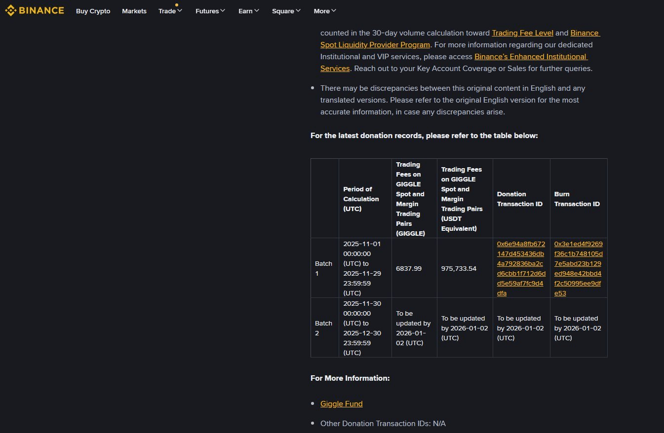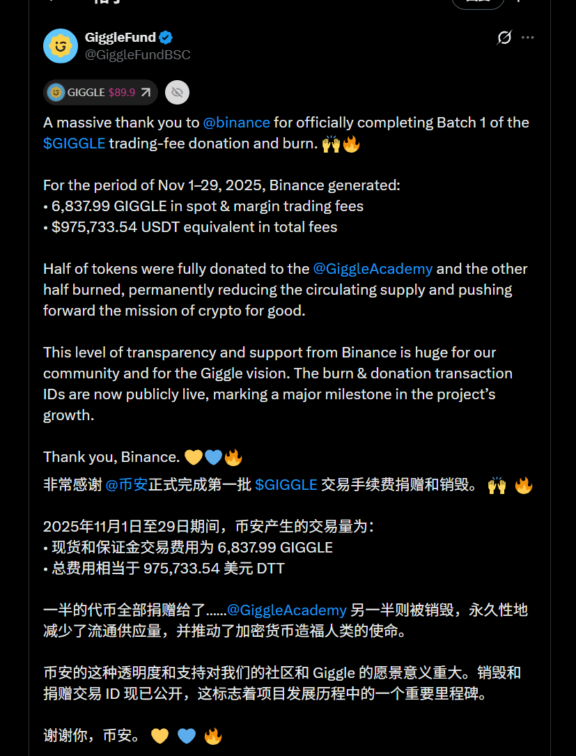 真的愣了幾秒鐘。幣安第一次公開執行 Giggle 的手續費捐贈 + 永久銷燬,
