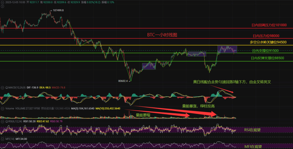 MACD死叉雖現,但黃白線回落至0軸下方後,量能柱已出現“綠柱縮量”信號——這是空頭動能衰減的徵兆!支撐位91500和88500是關鍵防線,若守住這兩個位置,配合RSI的50.28中性值,反彈隨時可能啓動。而上方98000壓力位一旦突破,空單將面臨“爆倉懸崖”!