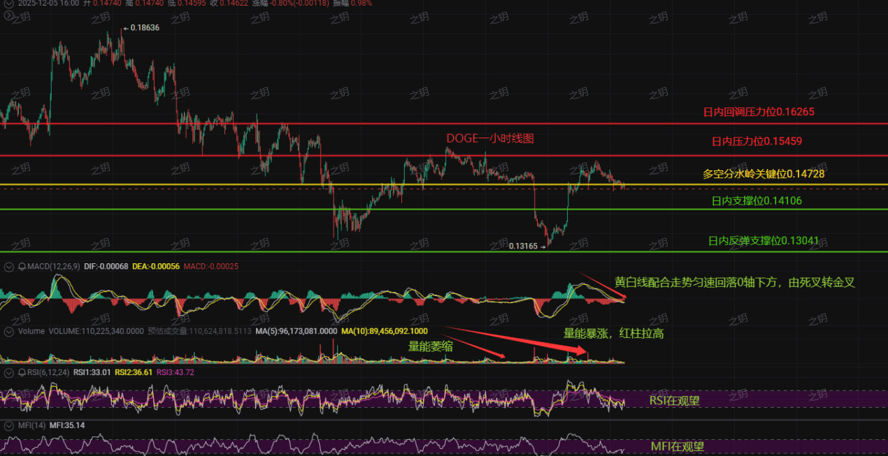 今天盯着DOGE的一小時圖,我後背發涼——黃白線在0軸下方勻速回落,死叉剛有轉金叉的苗頭,但整個趨勢還是向下壓的。