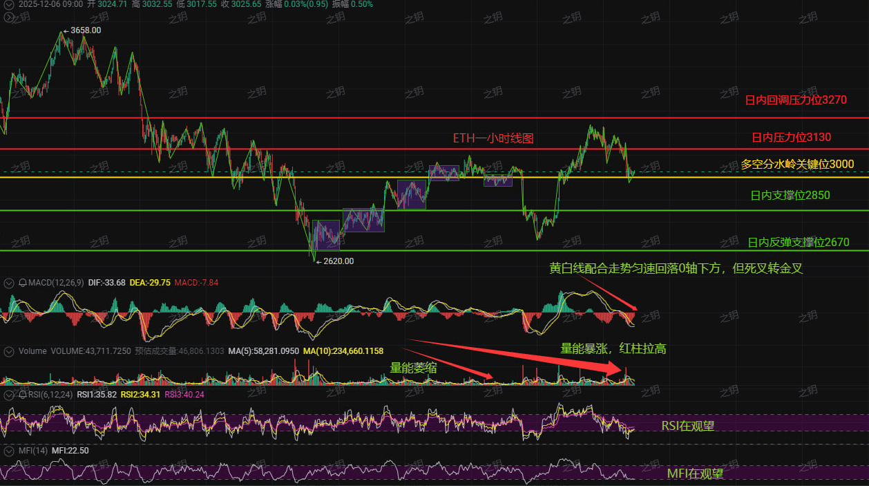 一小時圖上,ETH開在3024,高不過3032,低探3017,最後收在3025,幾乎原地踏步。但注意——振幅只有0.5%,成交量卻明顯萎縮。這叫“量能賽珠”,好比跑步時突然慢下來喘口氣,接下來要麼衝刺,要麼倒地。