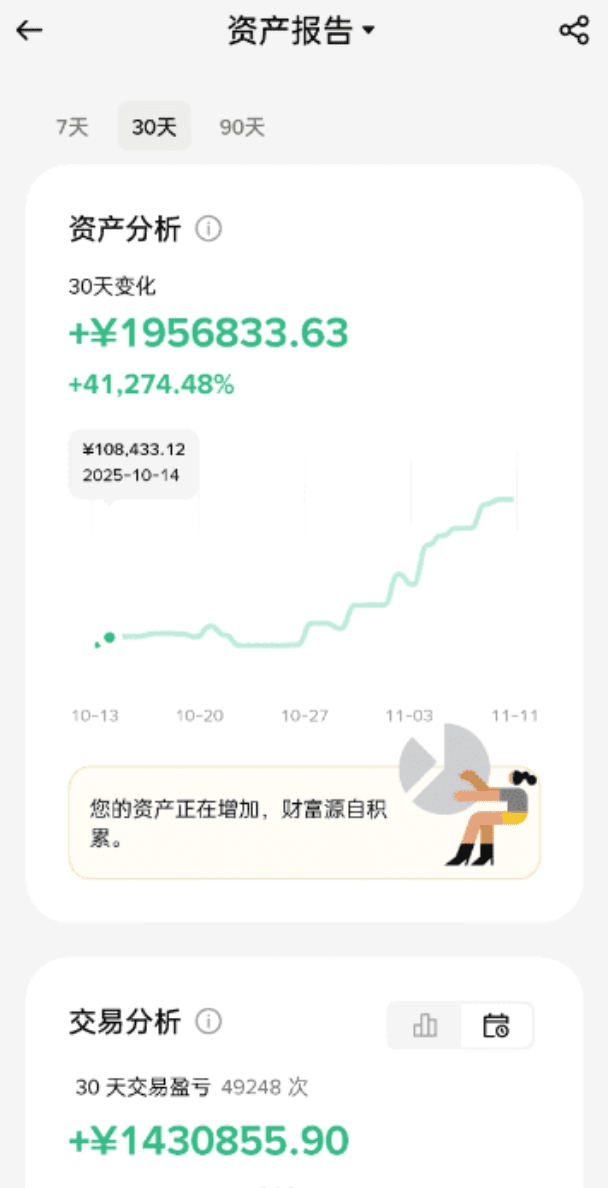 炒幣至今也有十多年了,從爆倉+到至今實現財務自由+,以炒幣養家,拿着70w,收益率達到41274.48%,30天合約滾倉賺到1400多萬!