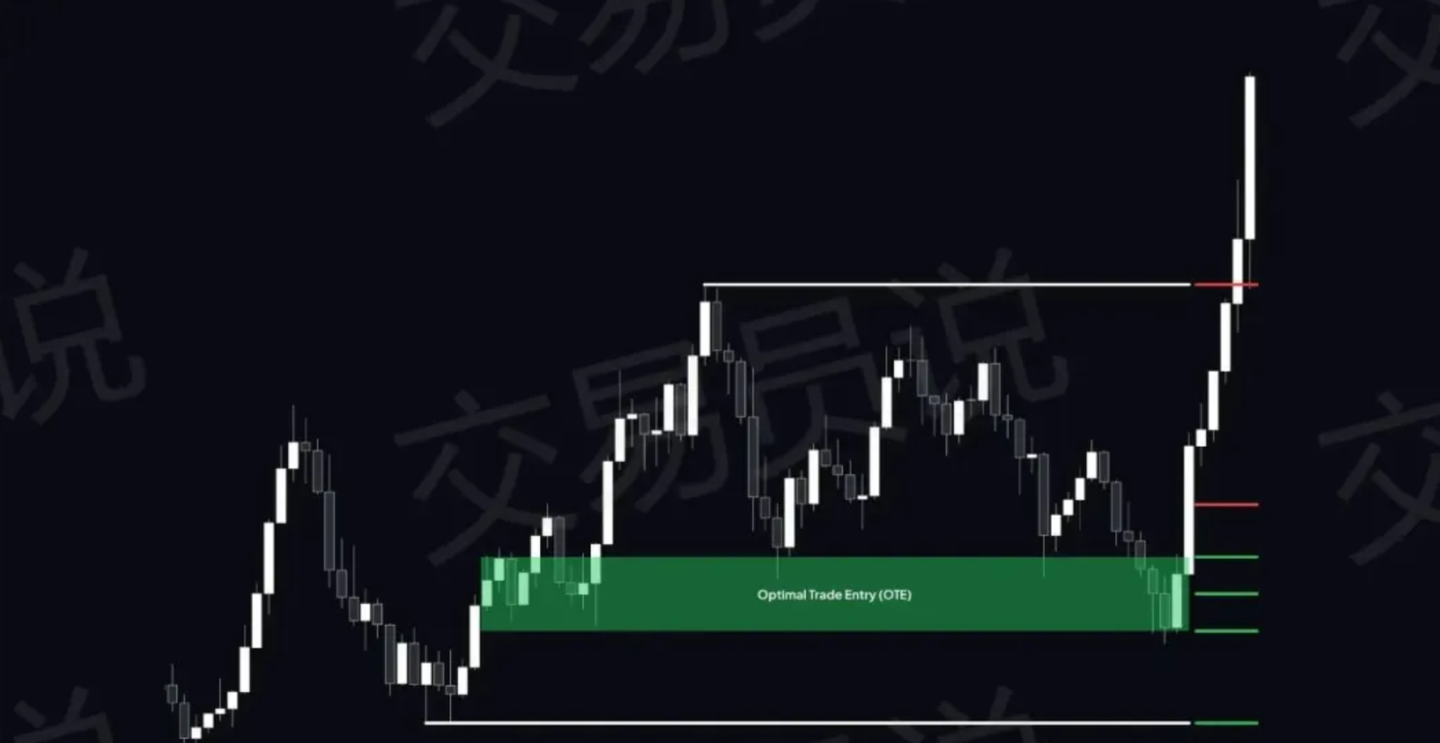 最佳交易進場區OTE(Optimal Trade Entry)位於0.618至0.79的回撤區間,被認爲是最理想的高概率進場區域。當POI與OTE區域重疊時,價格發生顯著反應的概率大幅提升。