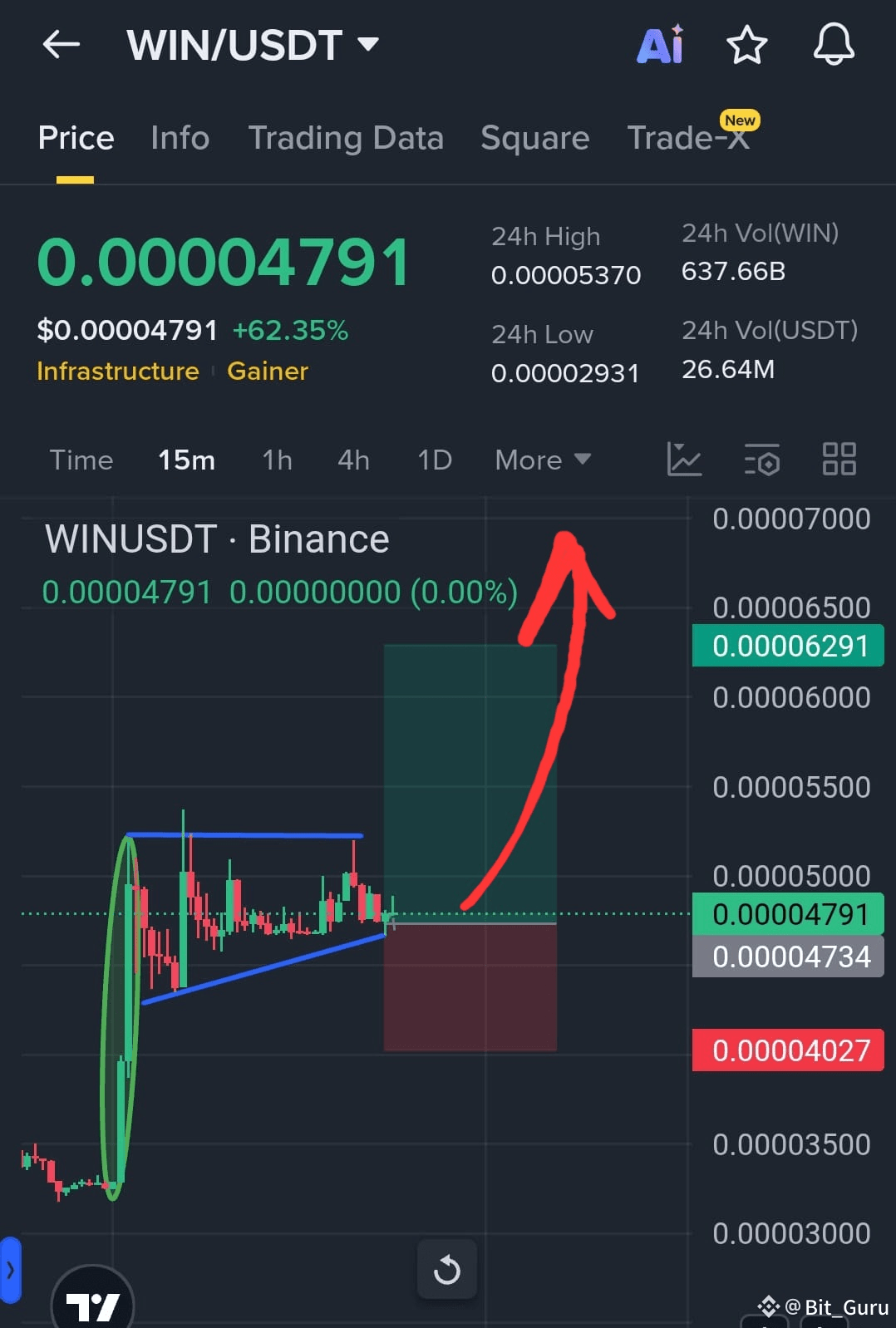 $WIN 正在15分鐘圖表中擠壓在上升三角形內。突破0.000048 = 快速跑向0.000060+。