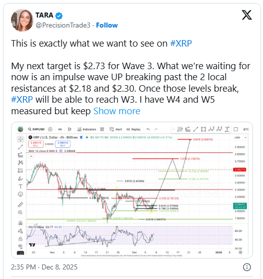 Tara的分析爲跟隨XRP下一步動作的交易者提供了清晰的框架。圖表突出顯示了$2.07的支撐位和$2.18及$2.30的阻力位。突破這些障礙將打開通往$2.73的道路。