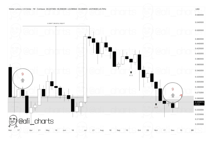 👉 圖表數據講述了一個有趣的故事。當TD序列9信號在這個水平出現時,XLM曾上漲95%。現在,XLM的交易價格接近$0.25,在短暫跌破該水平後反彈回支撐區間。這個設置看起來與7月反彈之前發生的情況驚人相似,具有相同的修正結構,導致信號的出現。