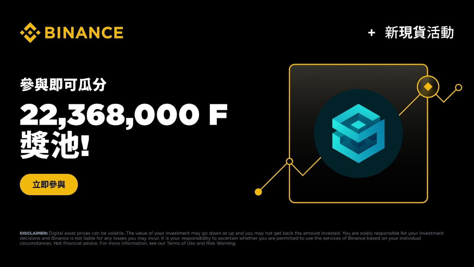 為了慶祝幣安最新代幣 SynFutures (F) 的上市,幣安現貨推出F交易挑戰的活動,符合資格的用戶將有機會瓜分22,368,000 F的代幣券獎池!